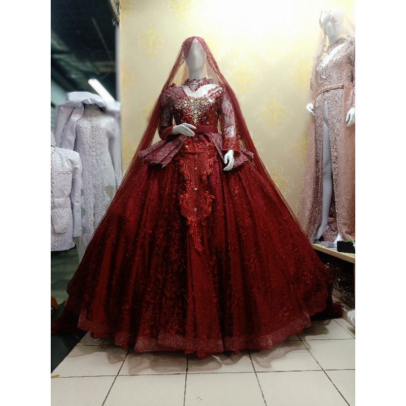 . Trend sekarang kalau tiada bridesmaid memang tak sah. Terlihat unik dan tidak biasa karena umumnya pengantin akan memilih warna putih. Baju gaun pengantin warna merah marun model krinolin full payet motif bunga garis garis wedding dress gown mekar muslim wanita perempuan muslimah hijab.